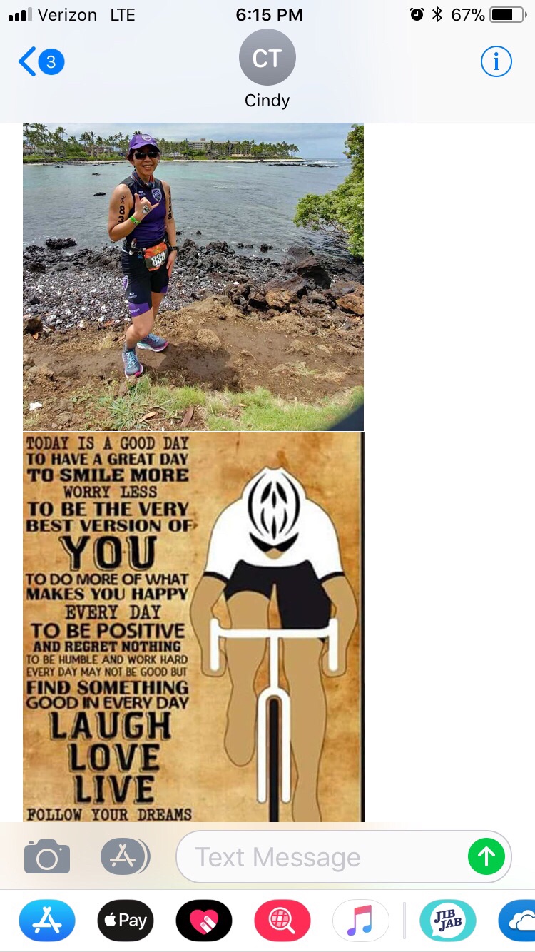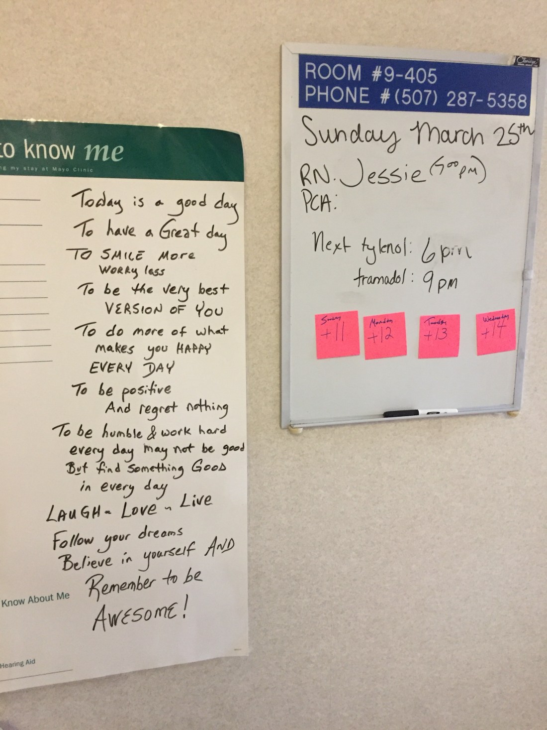 and commitment to take on the marathon life style! ( I hope you guys don’t mind that I added in your pics but they show us all that to work hard and finish even stronger is not easy but you pulled it off and shared that moment with me today! It meant so much to me that we were all connected through the day). After I got the quote poster from Cindy, I re -wrote it on my white board in my hospital room so I see all the time. Great visual to keep me and my team on the right path, hour by hour!